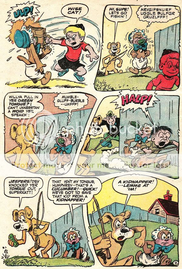 I haven't shown a Superkatt* story before; this is from Giggle Comics #54, June 1948. Dan Gordon was another of the group of moonlighting animators who provided the funny animal strips for Giggle and Ha Ha Comics. They didn't write down to their young readers. For the most part these comics were probably bought and read by parents to young children, but because of the skill level of the artists the comics are raised to a level where parents could also enjoy reading them.