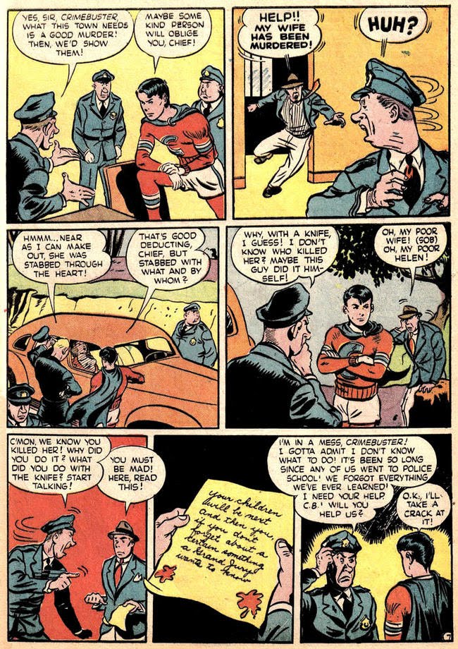 It might have had something to do with the idea that a kid, and the comic was aimed at young boys, obviously, could be a hero and make a difference by taking down crooks. Crimebuster, whose adult mentor was "Loover" of the FBI, looks to be about 14 or 15. The stories, not complicated, were at least dense with dialogue and plot, forcing a kid to read.