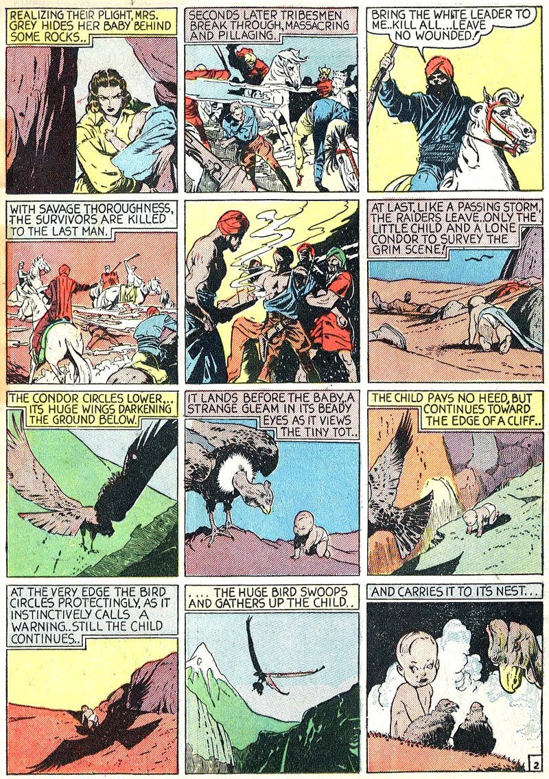 And I do admire the artwork, except when I read this story I'm struck by how bad this origin story is. And it's not just because it was written 70 years ago. I believe it was just as bad in 1940. Richard Grey Jr. is a foundling adopted by a Mama Condor. She feeds him. The idea of him swallowing regurgitated condor food, which is--urp! gag!--carrion (think of dead cattle, bloated and stinking). Revolting. The child grows up, but he takes a long time. Well, that's what humans do. We have a long childhood so our larger brains can develop. Dick seems determined to do what his fellow condors do, which is fly, so he uses that human brainpower to figure out air currents and such and pretty soon he's flying just like a condor.