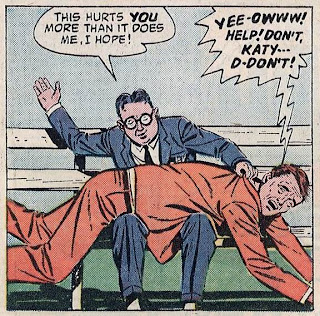We can get a quick sense of Caton from just those two panels; kind of a wimp and yet it's not really his fault, so we also sympathize with him. We subsequently learn that he has one particular tormentor: Bat Jennison, and a love object: Celia Jones. When he grows up, he applies for a job at the local rocket plant: