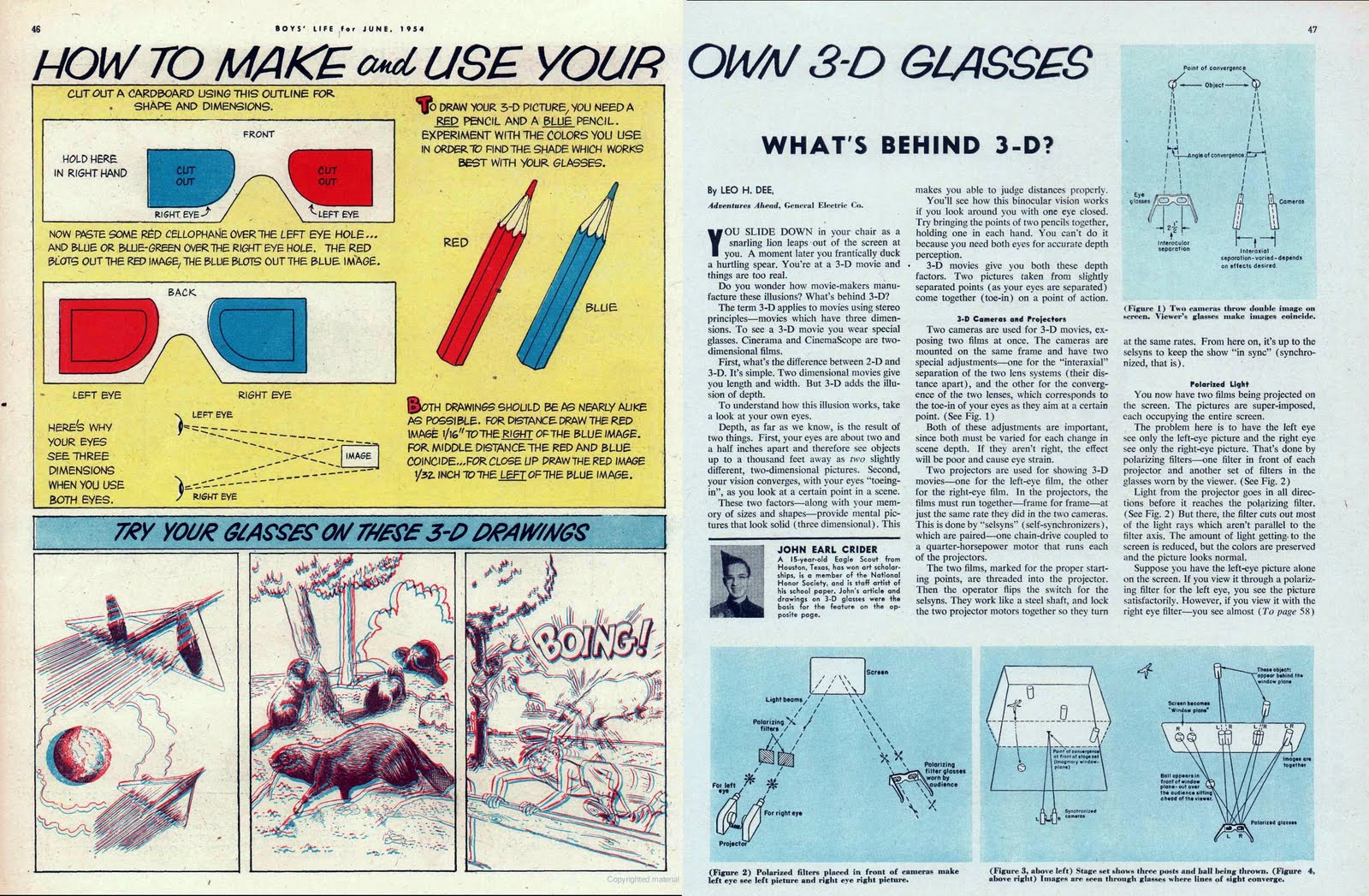 The 3-D fad was effectively over by the time this magazine appeared, but Boys' Life magazine for December 1954 had an article with illustrations on how to make your own 3-D glasses. If you don't have glasses and want to read the above story, now you can do it yourself.