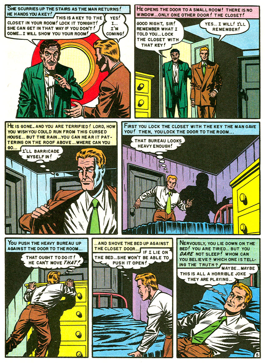 "The Strange Couple," written and drawn by Al Feldstein for the third issue of The Vault Of Horror (#15) in 1950, was turned into a 3-D story for EC Comics' second attempt at cashing in on the 3-D craze of the '50s, Three Dimensional Tales from the Crypt (cover title: Three Dimensional Tales from the Crypt of Terror). It was redrawn by—of all people—Mad comics' Will Elder, who did a very moody and effective job on the story.