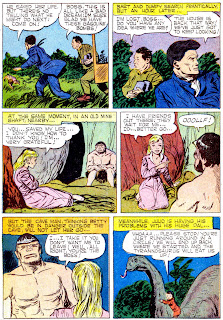 Dell Four Color #1120, Dinosaurus!, from 1960, is a Jesse Marsh job. He did the drawing and lettering.** It's tragic, a guy and a drawing board, so isolated he was dead for several days before his body was found. Some of the artwork in Dinosaurus is rushed, but even so his composition is solid. Despite his problems Marsh was still a professional.