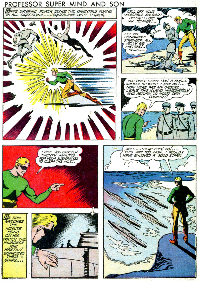It’s widely believed that Philip Wylie’s 1931 novel, Gladiator, is the trunk of Superman’s family tree. In Gladiator Hugo Danner is raised by his father to be a super human, just as Superman is sent to Earth with superpowers by his father. So Professor Supermind and Son, who appeared in Dellְ’s Popular Comics, appear to be a branch of the same tree.
