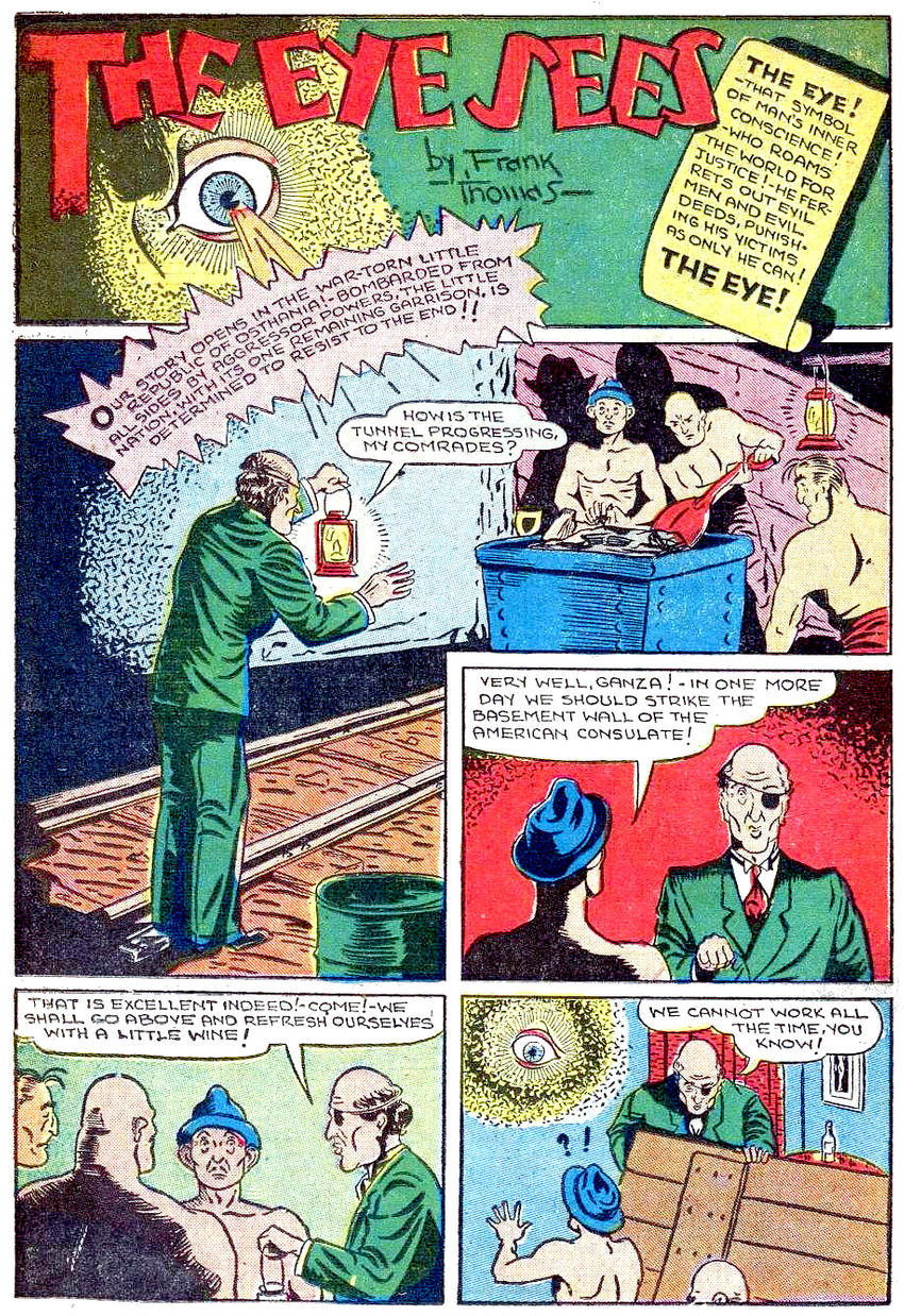 “The Eye Sees” by Frank Thomas appeared for a short time in Centaur Publication’s* Keen Detective Funnies, and in a couple of reprint issues, Detective Eye. The Eye was a mysterious creature whose origin was never explained, although in one issue the splash panel proclaims, “The Eye! A symbol of the haunting voice of man’s inner conscience! That mystic all-powerful force that causes evil deeds to boomerang and destroy those who plot them!” With that sort of mystical status you’d think The Eye would be an unseen force, but it has a physical presence, as we see in this story (the second published) from Keen Detective Funnies #18 (1940) when it is spotted by one of the gang members plotting sabotage.